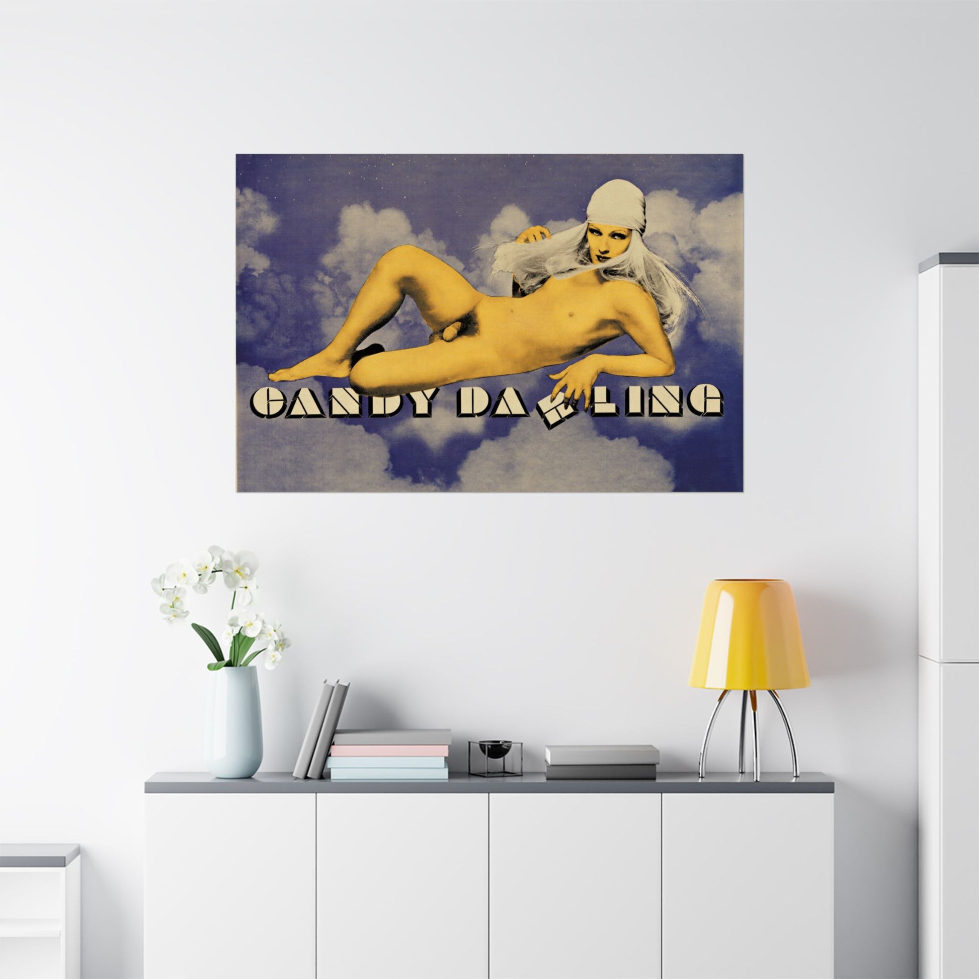 A reprint of the original Candy Darling poster depicting her floating in the clouds — an image first published in Andy Warhol’s newspaper, the short-lived publication that would evolve into Interview. The artwork captures Darling at her most iconic: poised, luminous, and framed in a visual language that blended celebrity portraiture with dreamlike fantasy.