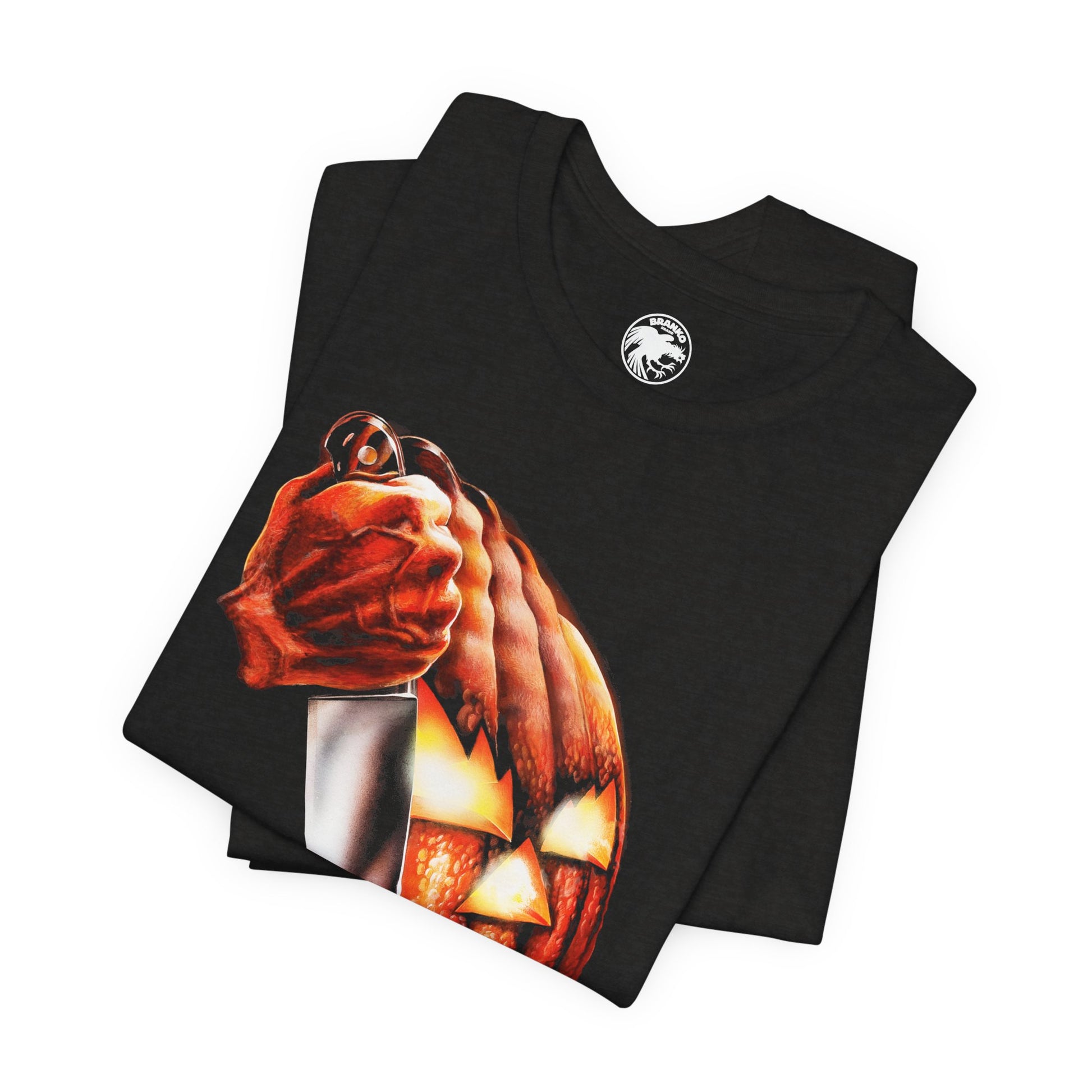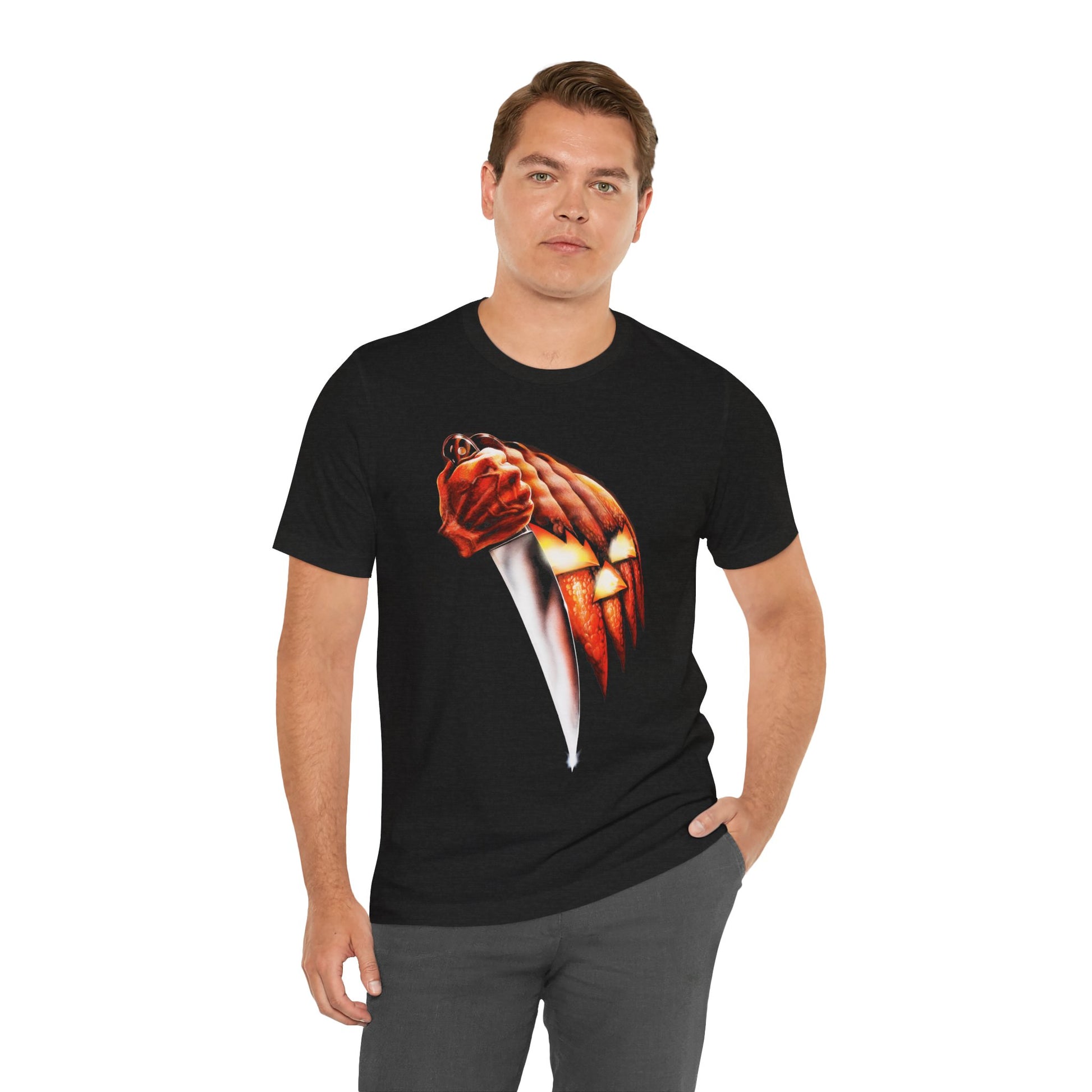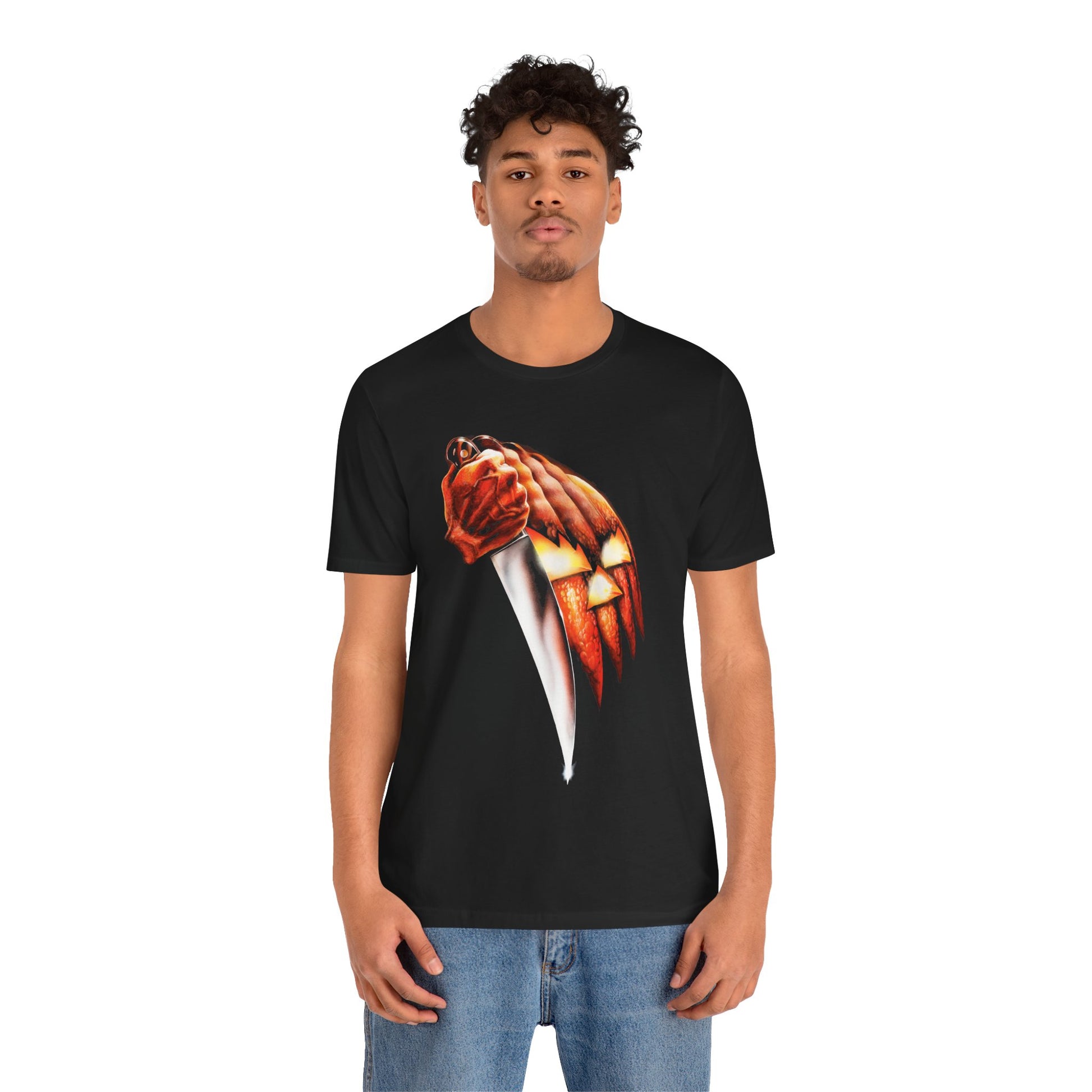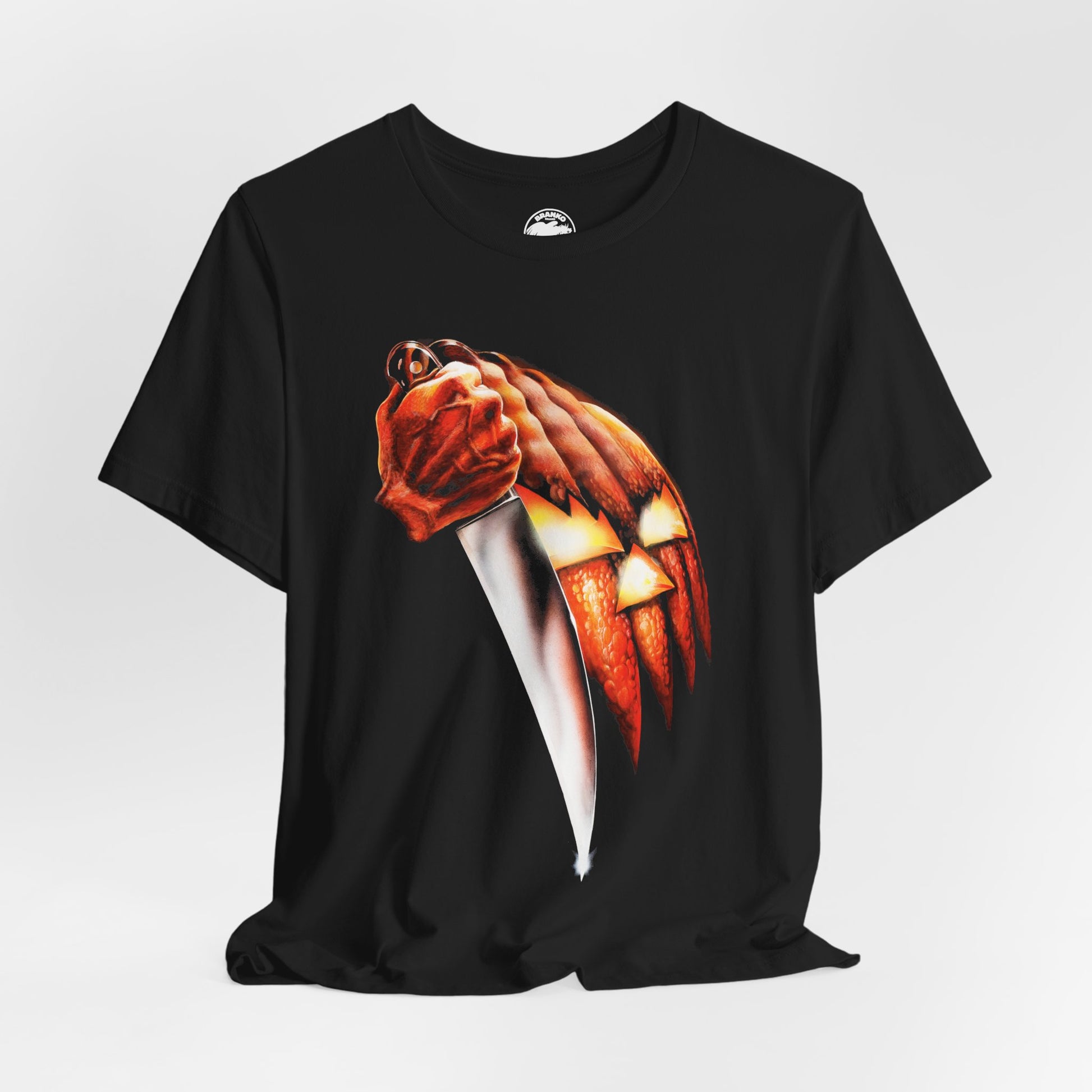 The design is deceptively simple: a glowing jack-o’-lantern morphing into a knife, its carved ridges forming the blade of a weapon. With its deep shadows and burning orange glow, the image became one of the most memorable movie posters ever created—instantly signaling that something dark was lurking on Halloween night.