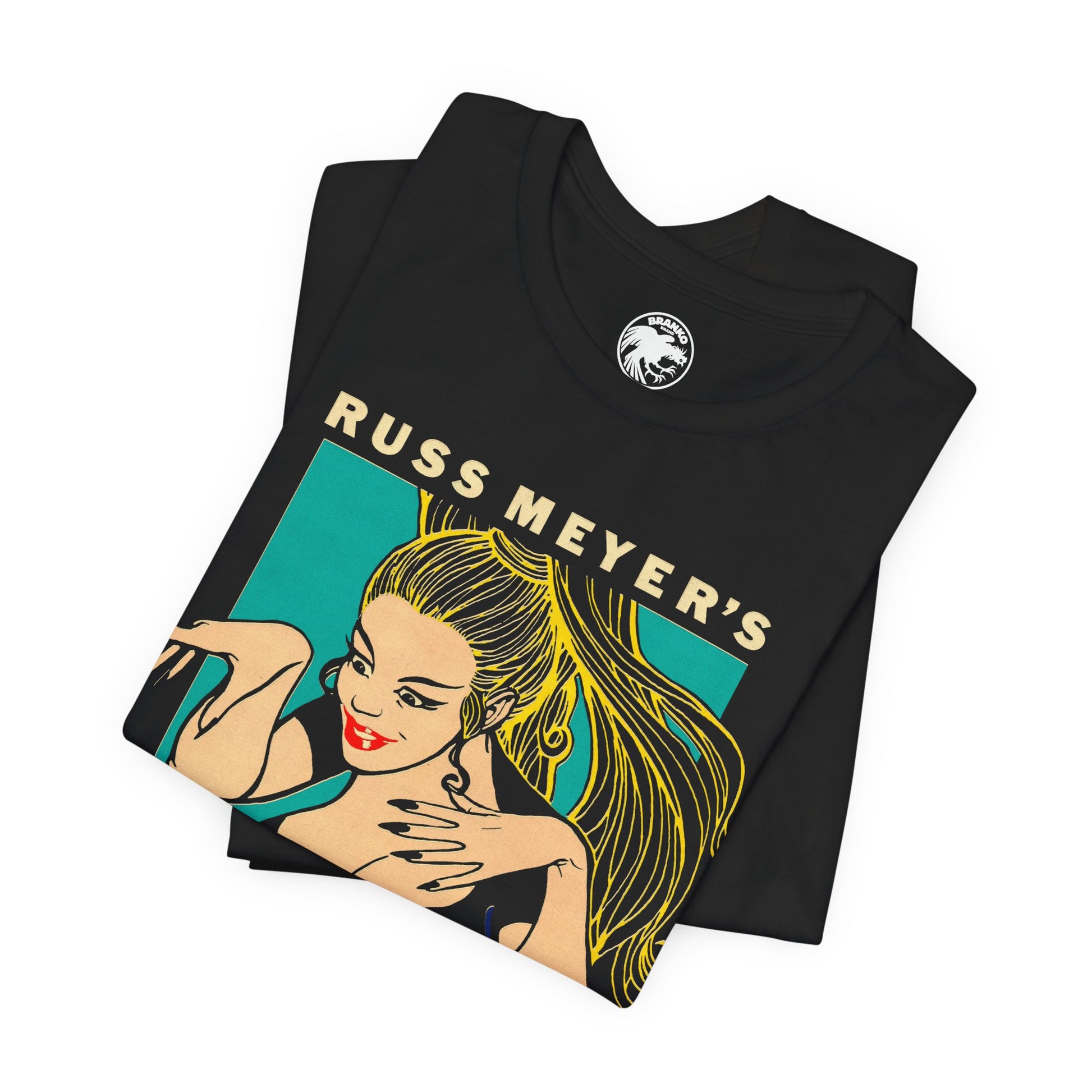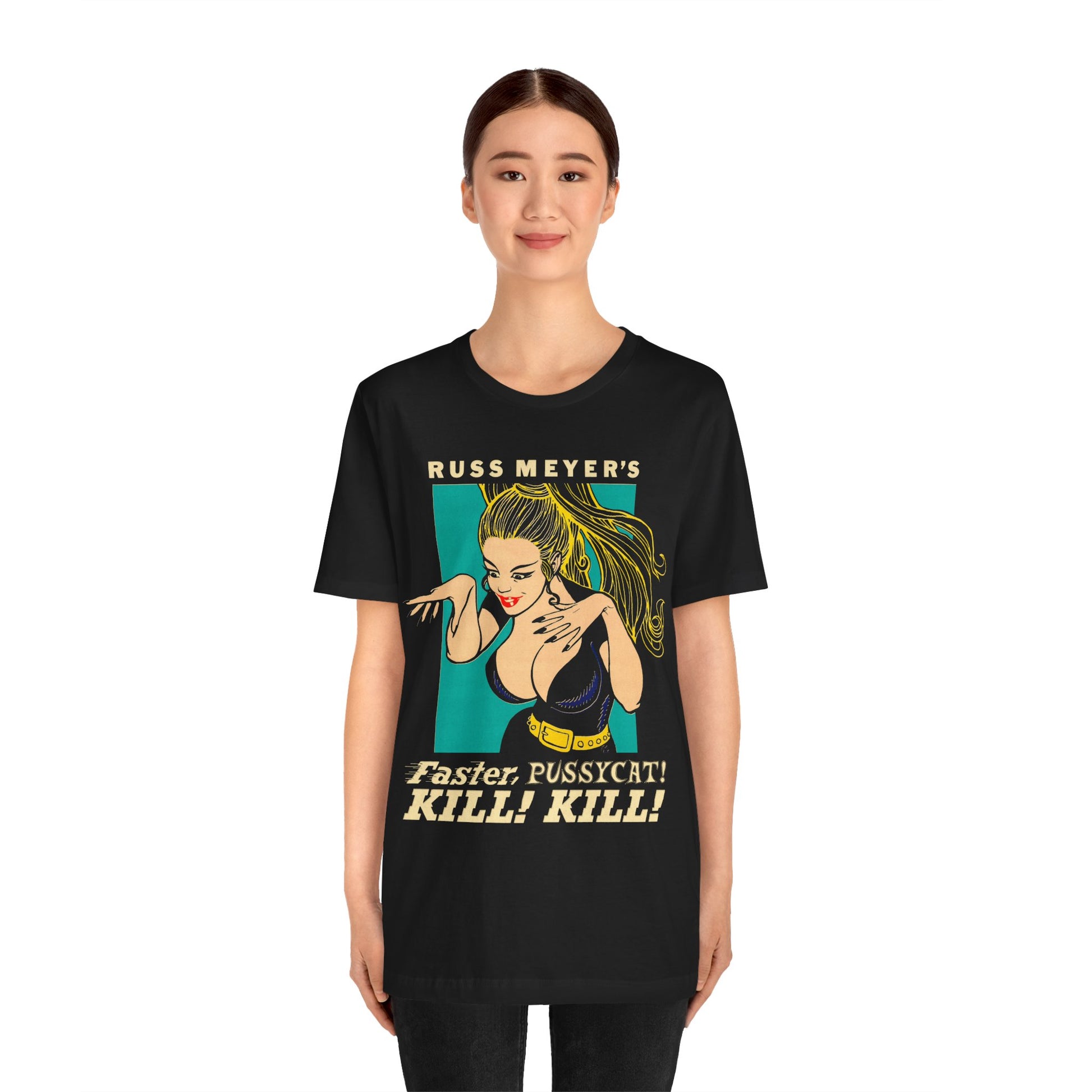 This shirt features the bold 1980's re-release artwork for Russ Meyer’s explosive 1965 cult classic Faster, Pussycat! Kill! Kill! — the film that turned go-go boots and vengeance into an art form. Revived for a new generation of punk kids and cinephiles, the reissue cemented its status as the ultimate grindhouse feminist fever dream.